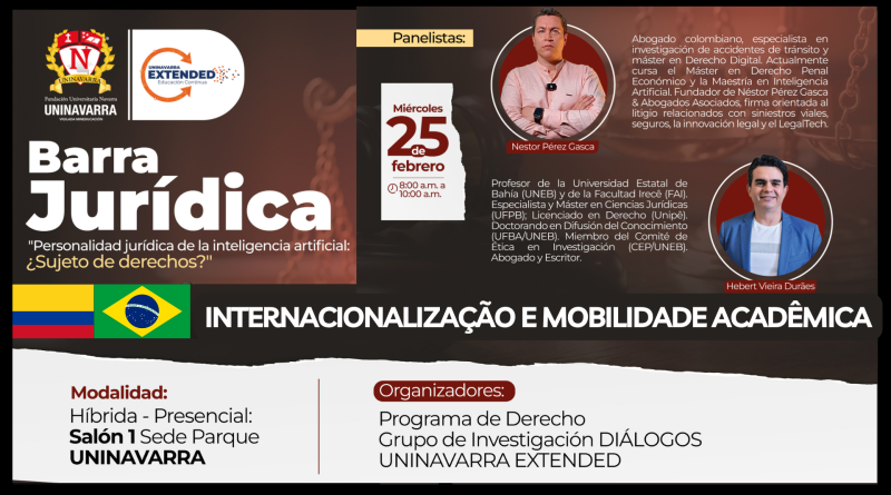 Na próxima quarta-feira (25/02) às 10h (horário de Brasília) o professor do curso de Direito Hebert Durães participará do evento virtual “Barra Jurídica” promovido pelo Grupo de Investigación DIÁLOGOS UNINAVARRA EXTENDED, debatendo sobre a personalidade jurídica da inteligência artificial. Seria a IA um sujeito de direitos? O convite foi realizado convite pela professora Dra. Diana Peña (Programa de Derecho UNINAVARRA) e o painel será compartilhado com o advogado colombiano Nestor Pérez Gasca.